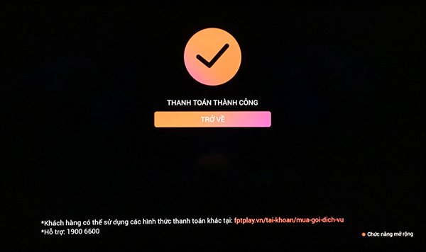 - Trên giao diện màn hình chính đã thông báo “Thanh toán thành công” tức là bạn đã nhận khuyến mãi thành công. Sau đó bạn Nhấn vào lựa chọn Trở về để sử dụng ứng dụng.