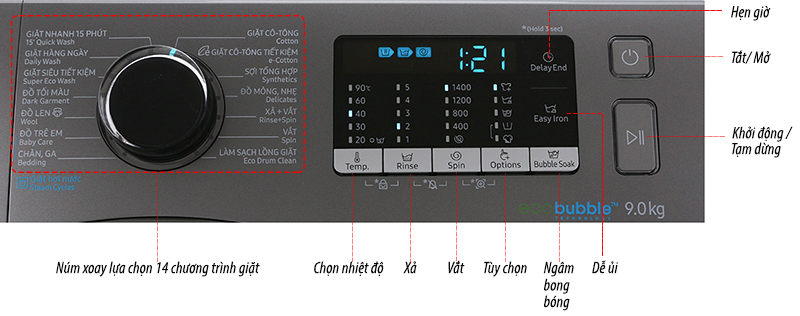 GIẶT SIÊU TIẾT KIỆM: Giặt bong bóng tiết kiệm ở nhiệt độ thấp, giảm điện năng tiêu thụ.