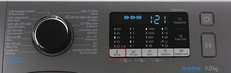 Với nút "Temp", bạn có thể tùy chỉnh nhiệt độ nước giặt từ 20 độ C đến 90 độ C giúp cho quần áo được giặt trong nước nóng, loại bỏ mọi vết bẩn cứng đầu nhanh chóng, đồng thời kháng khuẩn cho quần áo.