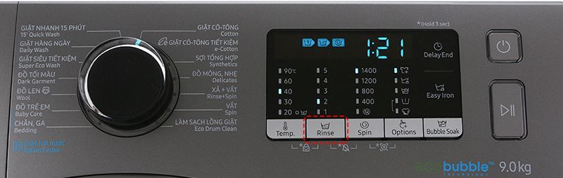 Với nút "Rinse", bạn có thể thay đổi số lần xả tối đa lên đến 5 lần. Đảm bảo cho quần áo không còn bám cặn bột giặt, gây dị ứng cho da.