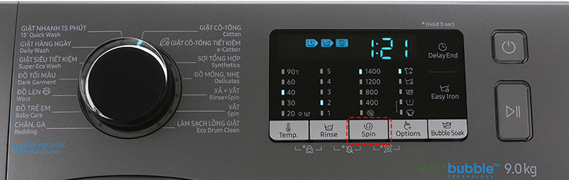 Với nút "Spin", bạn có thể thay đổi số vòng quay vắt quần áo. Giúp bảo vệ những chiếc quần áo mỏng manh không cần vắt hoặc đáp ứng mong muốn quần áo được khô ráo nước.