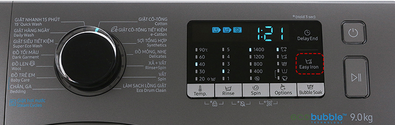 Khi nhấn nút "Easy Iron" quần áo của bạn sẽ được giảm thiểu nếp nhăn khi vắt, nhờ vậy việc là ủi sau mỗi mẻ giặt sẽ trở nên nhanh chóng và đơn giản.