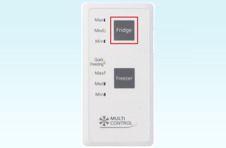 Ấn nút "Fridge" chọn các mức "Min - Med - Max" để chọn nhiệt độ mong muốn, trong đó mức Min là ít lạnh nhất, Max là lạnh nhất.