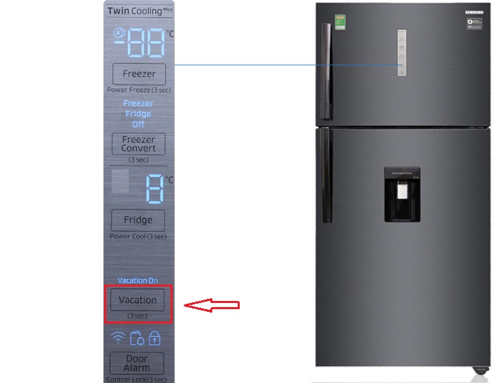 Để kích hoạt chế độ Vacation (Kỳ nghỉ), nhấn và giữ nút "Vacation" trong 3 giây, chế độ này hữu ích khi bạn không sử dụng tủ lạnh trong một thời gian dài, hoặc đi du lịch, nghỉ mát dài ngày. Đèn báo chế độ kỳ nghỉ sẽ sáng trong khi màn hình nhiệt độ tủ lạnh sẽ tắt. Nhiệt độ tủ lạnh sẽ được kiểm soát dưới 15 °C, nhưng ngăn đá vẫn hoạt động theo thiết lập trước đó(Ví dụ trước đó thiết lập là -23 độ thì ngăn đá vẫn hoạt động ở -23 độ, ngăn mát sẽ hoạt động dưới 15 độ).
