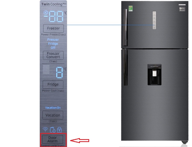 Nhấn nút "Door Alarm" để tắt hoặc bật cảnh báo mở cửa, nếu cửa mở quá 2 phút, âm thanh cảnh báo sẽ phát lên kèm theo nhấp nháy đèn cảnh báo nếu bạn quên đóng cửa tủ.