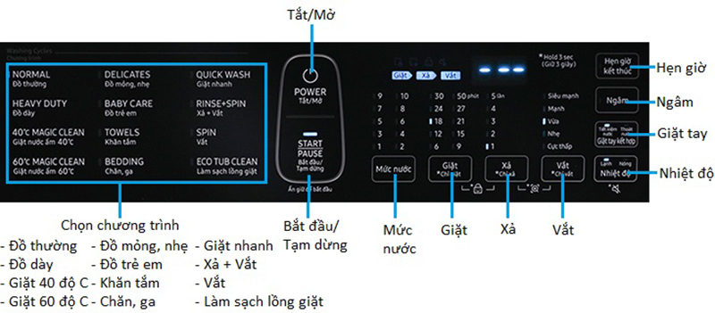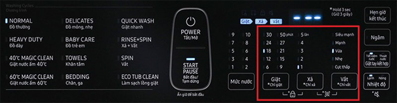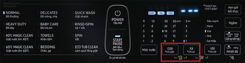 - Nhấn lần lượt các nút Giặt, Xả, Vắt để kích hoạt chu kỳ riêng theo nhu cầu của bạn. Thời gian, số lần hoặc tốc độ của mỗi chu kỳ có thể điều chỉnh được bằng cách nhấn nút tương ứng: