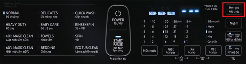 - Nhấn giữ STAR/PAUSE máy giặt sẽ hiển thị đèn báo cạnh nút "Hẹn giờ kết thúc" và bộ đếm giờ sẽ bắt đầu đếm.