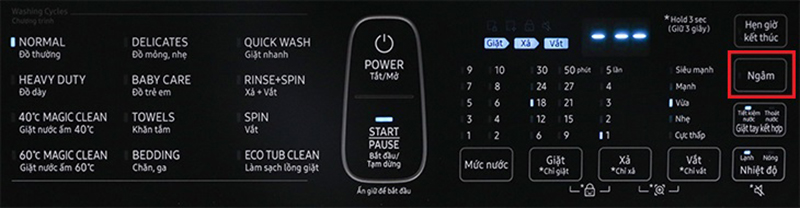 Nút Ngâm cho phép bạn thêm thời gian ngâm quần áo trước khi chu trình giặt bắt đầu. Nhờ vậy giúp quần áo loại bỏ được vết bẩn tốt hơn.