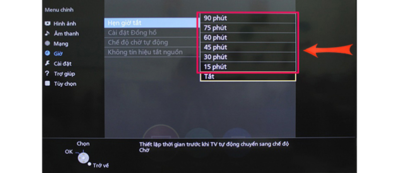 Bước 4: Một cửa sổ hiện ra, trên cửa số này có nhiều mốc thời gian hẹn giờ tắt, người dùng tùy theo nhu cầu mà chọn mốc thời gian mình muốn.