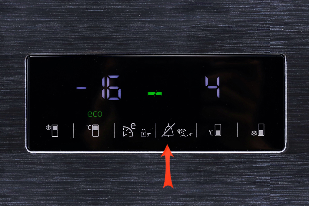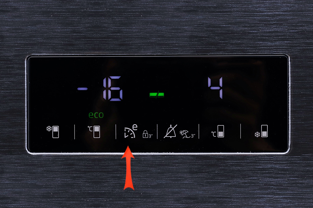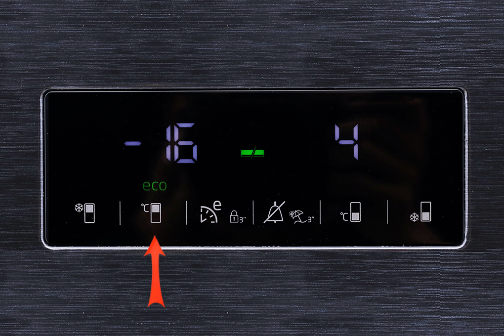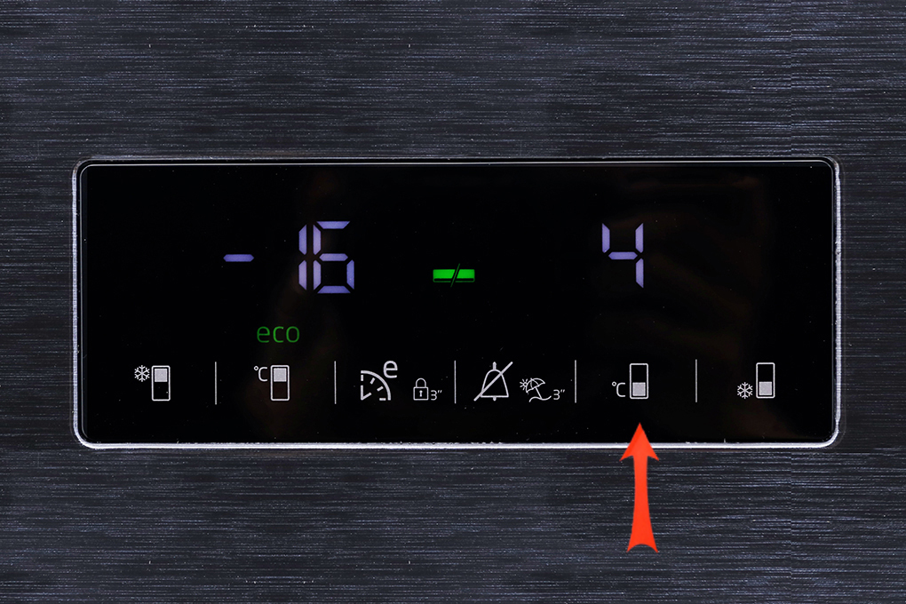 Chọn biểu tượng hình chữ nhật có vạch trắng ở phía dưới cùng (kế bên có kí hiệu độ C) để điều chỉnh nhiệt độ ngăn mát đến mức bạn mong muốn. Nhiệt độ ngăn mát có thể tùy chỉnh từ 1 đến 8 độ C.