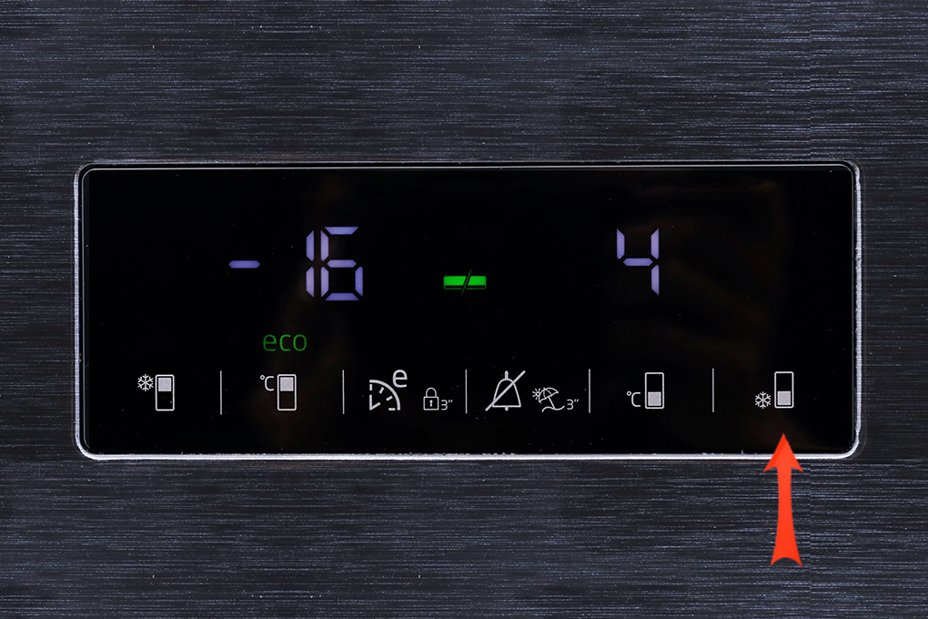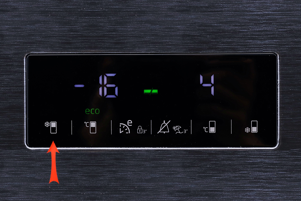 Chọn biểu tượng hình chữ nhật có vạch trắng ở phía trên cùng (kế bên có kí hiệu độ C) để lựa chọn nhiệt độ ngăn đá. Nhiệt độ ngăn đá bạn có thể chọn nằm trong khoảng từ -24 đến -16 độ C.