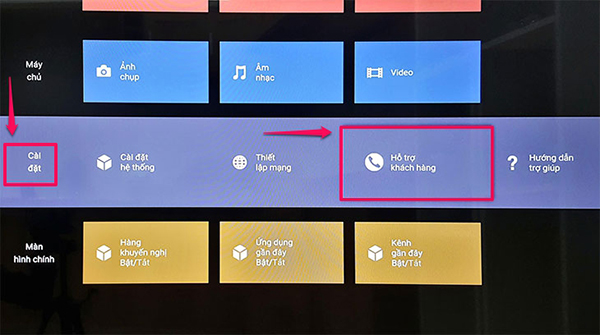 Bước 1: Bạn nhấn nút HOME trên remote, sau đó bạn tiếp tục tìm mục Cài đặt và đến mục Hỗ trợ khách hàng.