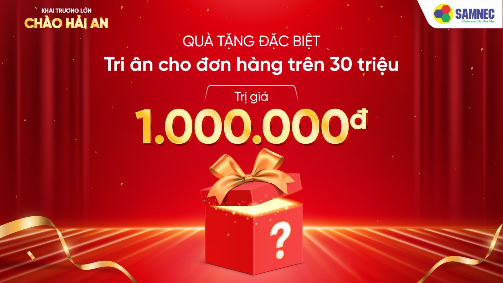 Nội dung khuyến mại: Khách hàng mua tivi, tủ lạnh, máy giặt, gia dụng tại cửa hàng Điện Máy Samnec Hải An có tổng hoá đơn từ 30.000.000đ trở lên sẽ được tặng ngay 1 phần quà trị giá 1 triệu đồng.