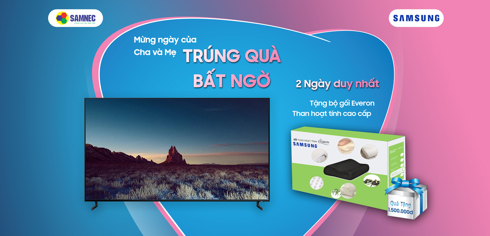 - 10 khách hàng đầu tiên mua tivi Samsung trong ngày sẽ được tặng 01 bộ gối than hoạt tính Everon cao cấp (trị giá 1,5 triệu đồng)