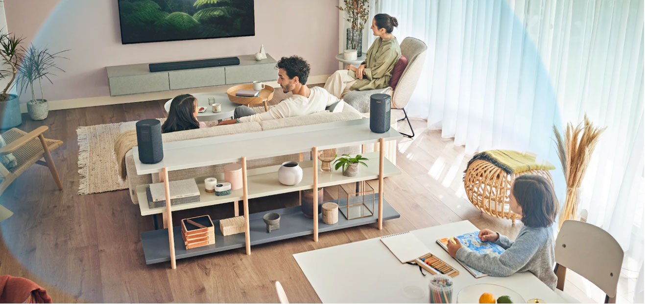 Vùng nghe rộng lan đến mọi nơi trong phòng khách để mọi người trong nhà đều có cùng trải nghiệm âm thanh. Vùng nghe không chỉ giới hạn ở phía trước TV mà bao trùm không gian rộng hơn nhiều.