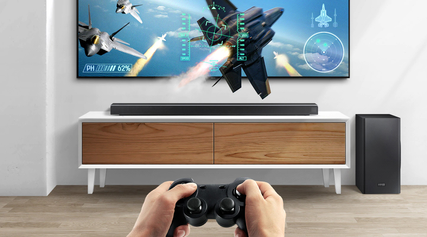 Sắc âm trầm mạnh mẽ từ loa siêu trầm kết hợp với thanh sắc uy lực phát ra từ loa đánh trần đưa bạn chìm vào những màn game kịch tính nhất. Loa Thanh tự động chuyển sang Chế Độ Game khi kết nối với TV Samsung, cho phép bạn hoàn toàn tập trung vào trận đấu mà không cần mất thời gian chỉnh sửa các thiết lập phù hợp.