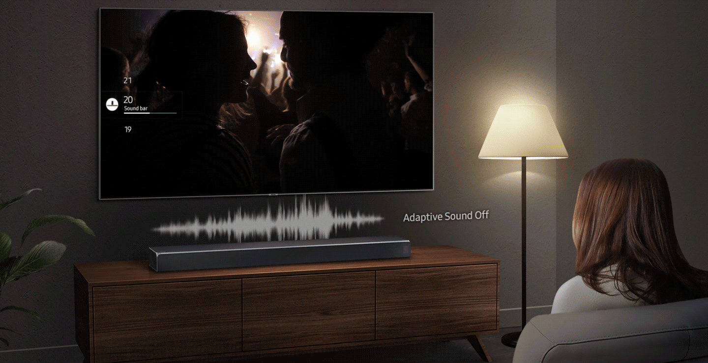 Loa Thanh Samsung tự động phân tích và tối ưu âm thanh trên từng khung hình hiển thị tương ứng. Với khả năng điều chỉnh chế độ âm thanh tự động (Adaptive Sound) khiến các thanh âm trở nên sắc nét dù cho âm lượng đang ở mức thấp, cho phép bạn lắng nghe rõ ràng mọi nội dung hay các cuộc hội thoại.