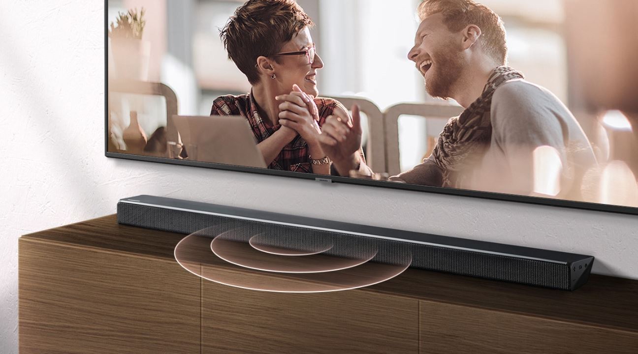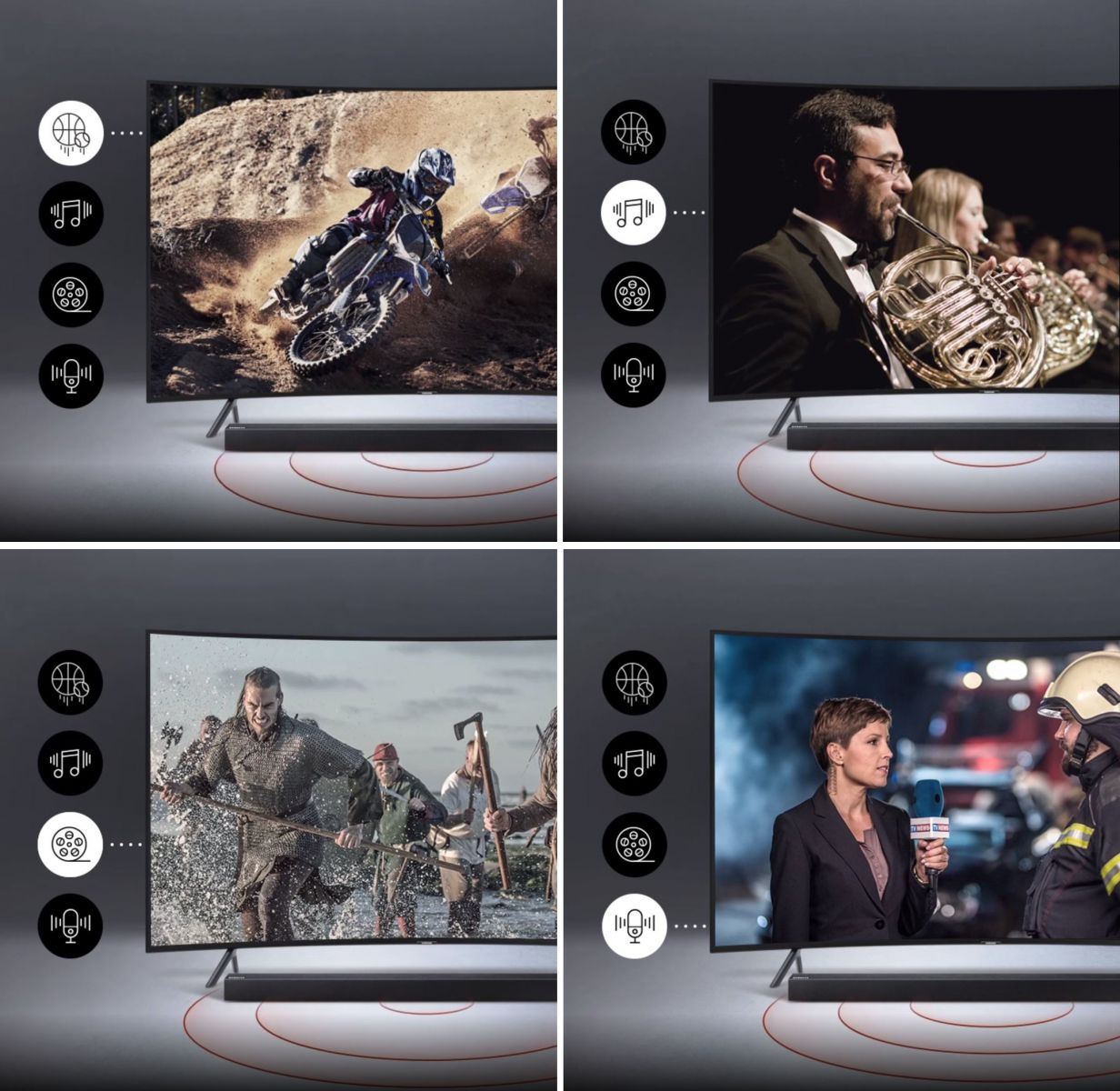 Loa Thanh Samsung tự động phân tích và tối ưu âm thanh trên từng khung hình hiển thị tương ứng. Thoải mái cuồng nhiệt cùng những trận cầu kịch tính hay dễ dàng lắng nghe trọn vẹn những cuộc hội thoại trong phim với thanh âm sắc nét phát ra từ Loa Thanh.