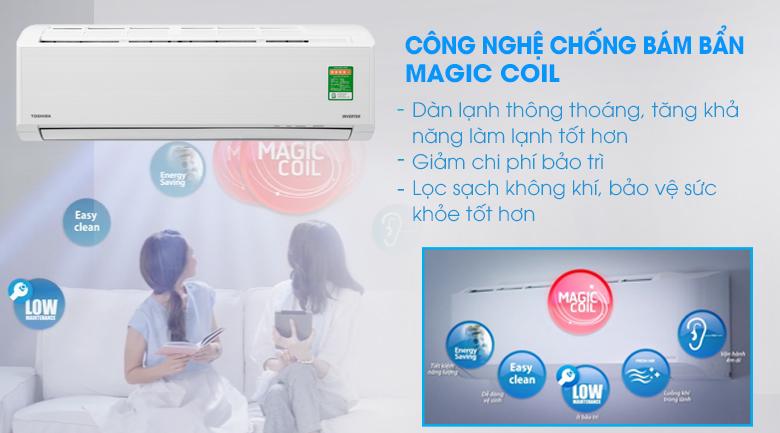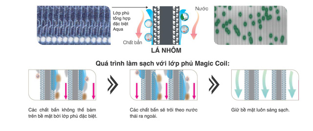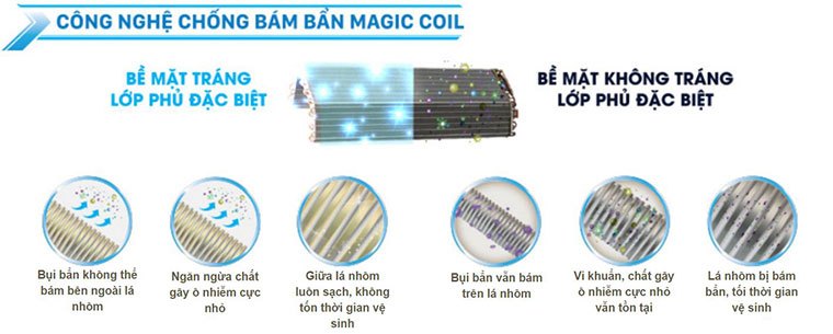 Magic Coil là một hệ thống thông minh với bề mặt phủ lớp tráng nhôm đặc biệt, giúp cho bụi bẩn không thể bám trên bề mặt ngoài của lá nhôm. Nhờ đó, điều hòa sẽ ngăn ngừa được các tác nhân gây hại hoặc chất gây ô nhiễm cực nhỏ trên dàn lạnh.