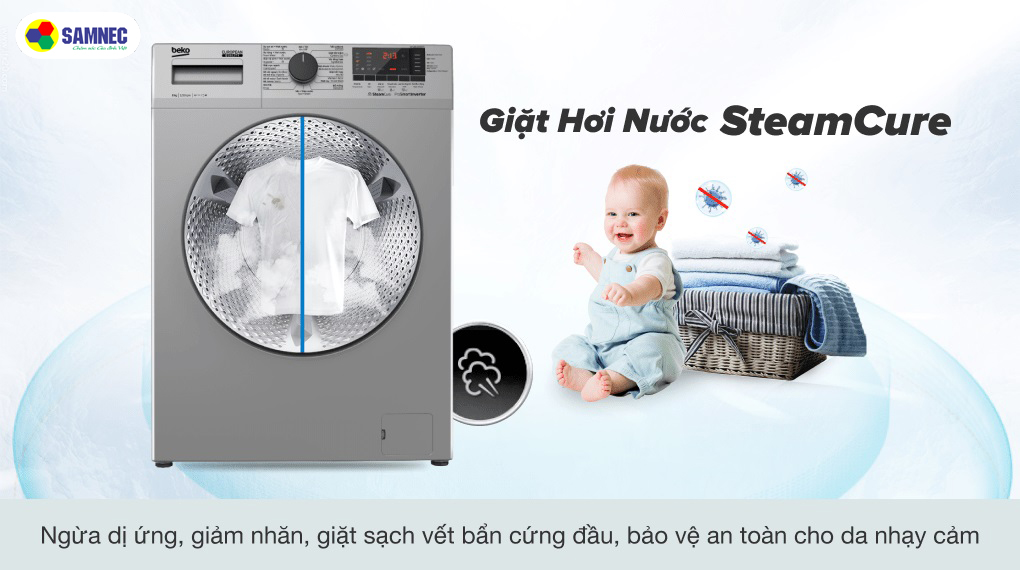 Công nghệ SteamCure có trong chiếc Beko WCV8614XB0STS sẽ thay bạn xử lý vết bẩn trước khi giặt bằng cách phun hơi nước vào để làm mềm vết bẩn, giúp máy giặt dễ dàng lấy đi các vết bẩn. Không những thế, công nghệ này còn giúp loại bỏ vi khuẩn cùng các tác nhân gây dị ứng trên da cũng như giảm các nếp nhăn sau khi giặt.