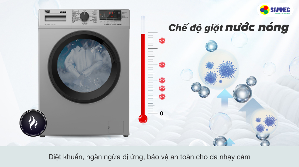 Máy giặt Beko này được trang bị chức năng giặt nước nóng, có thể chọn từ 30°-90° giúp hòa tan bột giặt nhanh chóng đồng thời tiêu diệt các vi khuẩn tích tụ trên quần áo, đặc biệt cần thiết đối với các gia đình có trẻ nhỏ.