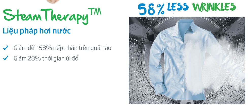 Công nghệ AirTherapy sử dụng luồng khí nóng tuần hoàn trong lồng giặt giúp giặt sạch, sấy khô và giảm nhăn tối ưu 1 kg quần áo chỉ trong vòng 120 phút.