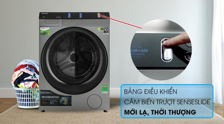 Máy giặt sấy Toshiba Inverter 8 Kg TWD-BH90W4V được ra mắt trong năm 2019 khoác trên mình tông màu xám đen lịch lãm, hiện đại. Đi cùng bảng điều khiển cảm biến trượt SenseSlide mới lạ, kết hợp hệ thống đèn LED trên bảng điều khiển và đèn LED phát sáng khi mở cửa sẽ giúp cho bạn thuận tiện thao tác cài đặt chương trình cũng như bỏ vào hoặc lấy quần áo ra khi sử dụng máy trong điều kiện ánh sáng yếu.