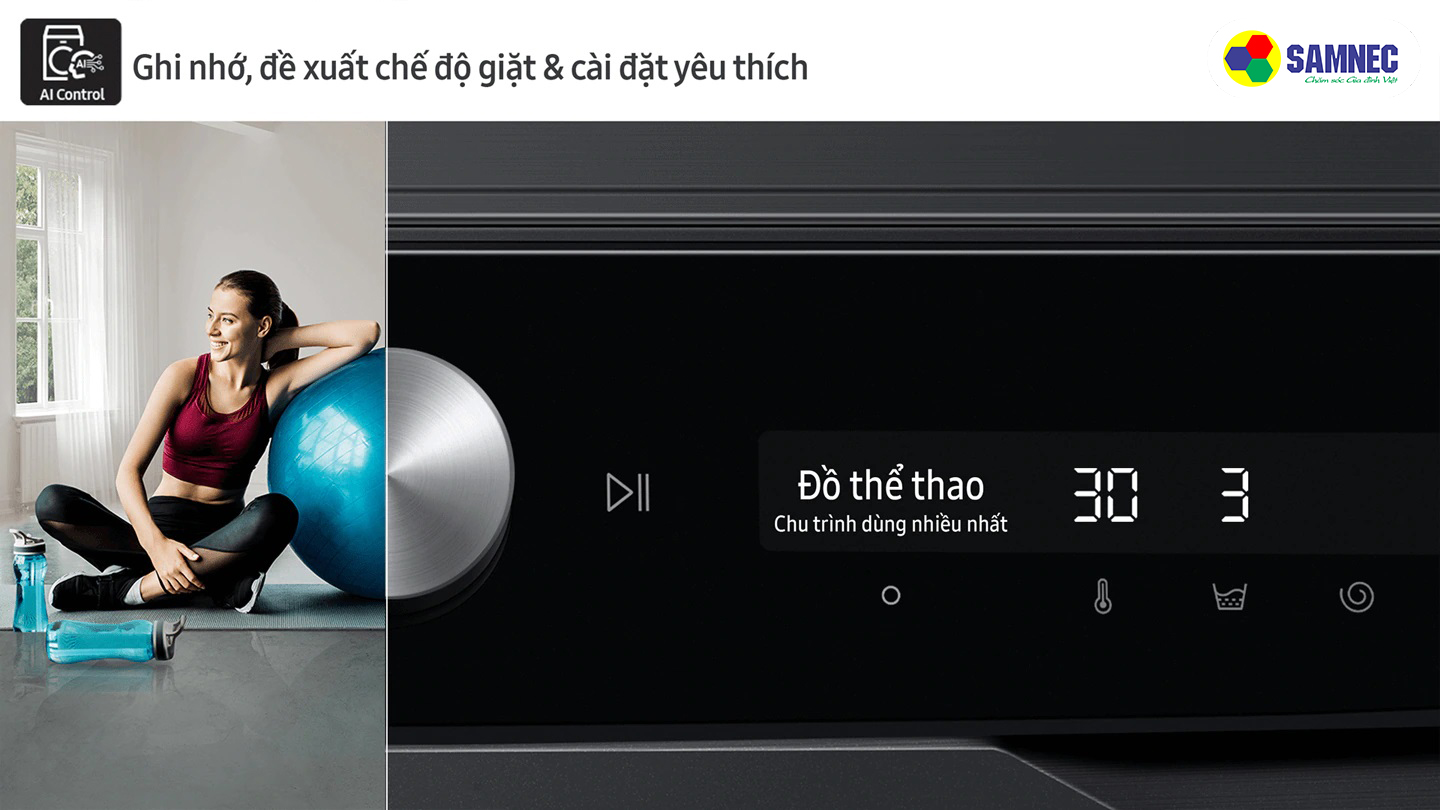 Bảng điều khiển AI được cài đặt tự động ghi nhớ, đề xuất chế độ giặt và cài đặt yêu thích dựa trên thói quen sử dụng, mà không cần phải chỉnh lại từ đầu mỗi khi giặt. Máy giặt có màn hình hiển thị điện tử rõ ràng, hướng dẫn dễ hiểu và có thể kết nối với điện thoại qua ứng dụng Smarthings điều khiển máy giặt mọi lúc.