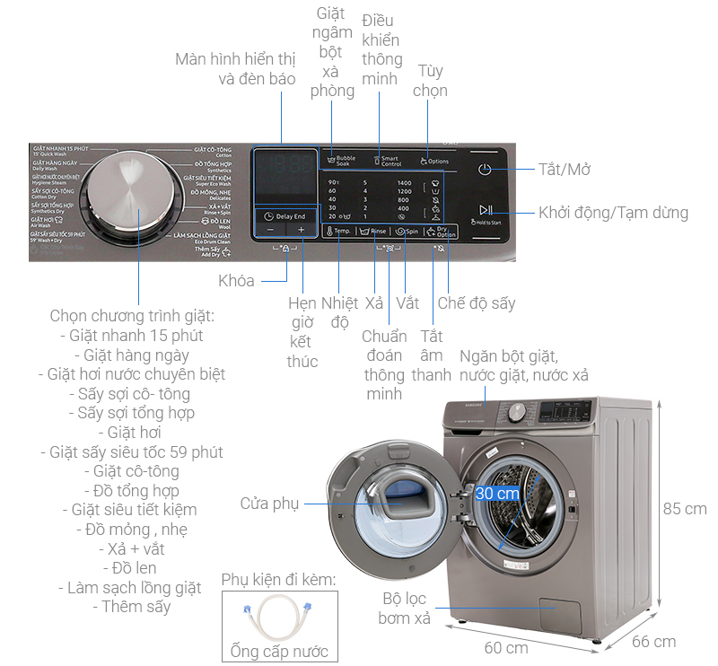 Máy giặt cửa trước này được tích hợp thêm tính năng sấy với khối lượng giặt là 10.5 kg và khối lượng sấy là 7 kg, giúp tiết kiệm thời gian phơi quần áo cũng như tiết kiệm chi phí về việc mua thêm máy sấy.