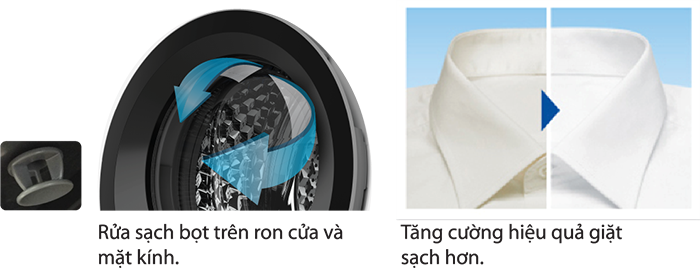 Với tính năng phun nước 360 độ của máy giặt Toshiba Inverter, bột giặt sẽ được làm tan nhanh chóng, rửa sạch bọt trên ron cửa và mặt kính giúp khu vực cửa máy sạch sẽ, bạn không phải tốn thời gian lau chùi như trước kia nữa.