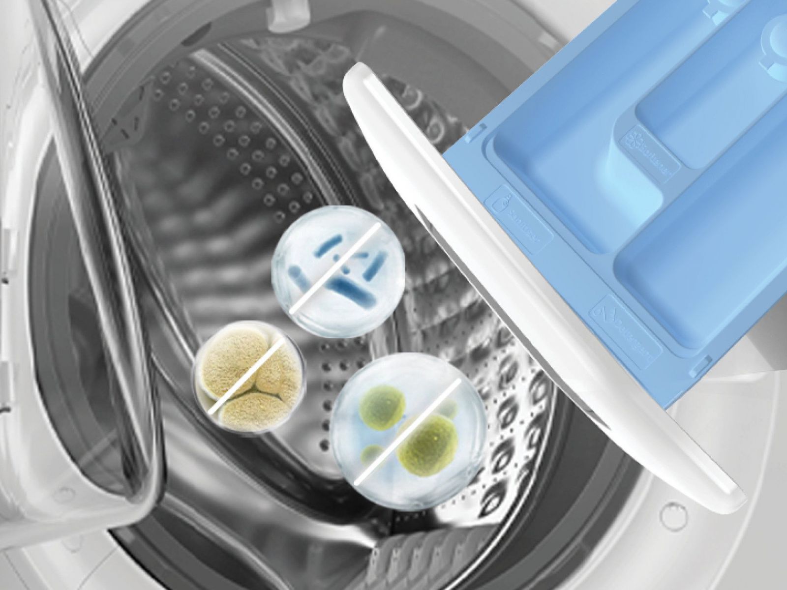 Khay nước giặt và đệm cửa được bổ sung chất khử khuẩn giúp ngăn chặn 99% * vi khuẩn và nấm mốc phát triển ngay cả sau khi sử dụng trong thời gian dài