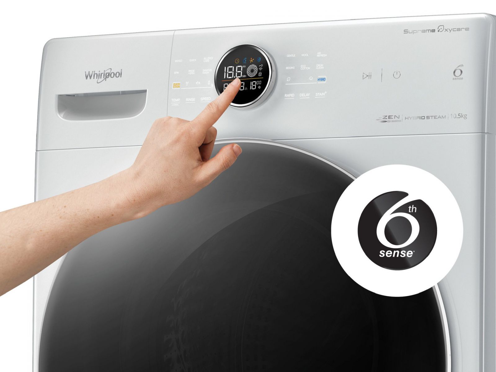 Công nghệ 6th Sense được cấp bằng sáng chế của Whirlpool, được xây dựng trong chế độ khởi động tự động. Công nghệ trực quan này cảm nhận được tải đồ giặt của bạn và tự động chọn một chương trình giặt phù hợp chỉ bằng cách nhấn và giữ núm vặn trong vòng 3 giây