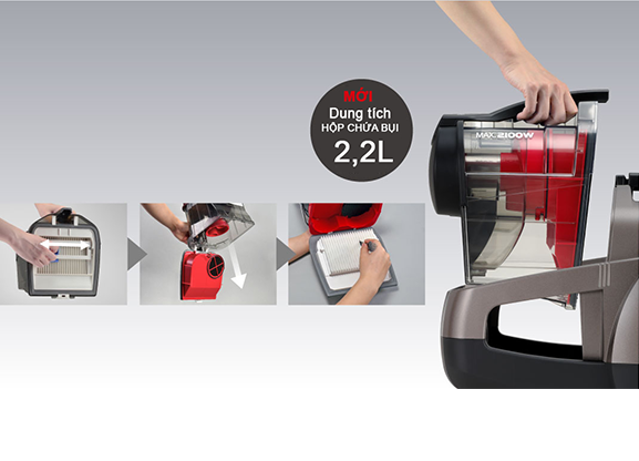 Hộp chứa bụi dung tích 2.2 lít hạn chế đi đổ rác nhiều lần.
