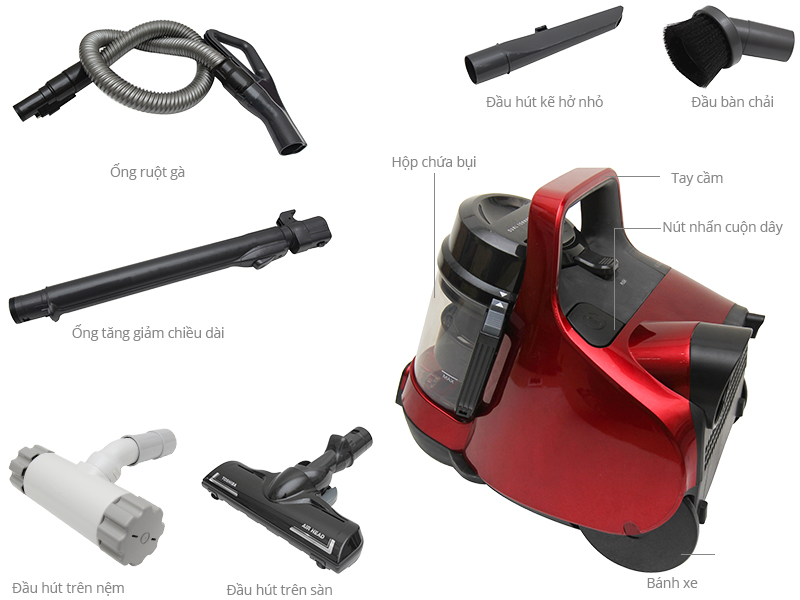 Dây điện tự thu gọn, Bánh xe tiện di chuyển, Điều chỉnh được lực hút, Điều khiển trên tay cầm, Hệ thống lực xoáy kép Toshiba TORNEO
