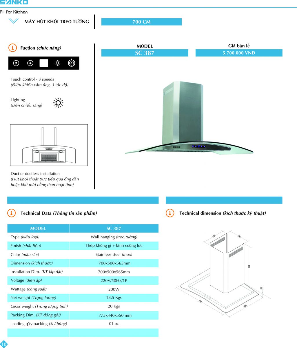 Máy hút khói treo tường SC387 phù hợp cho các không gian bếp rộng, thân vỏ được làm bằng inox và kính cường lực mang đến sự sang trọng.