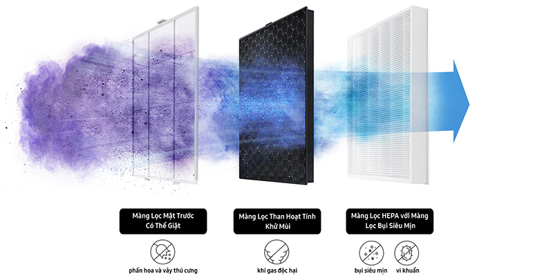 Giữ cho không khí trong lành và sạch khuẩn với hệ thống Màng Lọc Nhiều Lớp. Màng lọc Than Hoạt Tính giúp khử mùi và loại bỏ nhanh chóng các khí độc hại*. Lớp lọc HEPA có khả năng lọc đến 99.97% hạt bụi siêu mịn** và diệt vi khuẩn*** trong không khí.