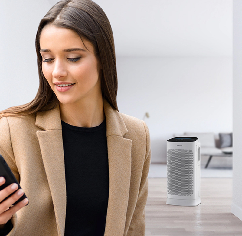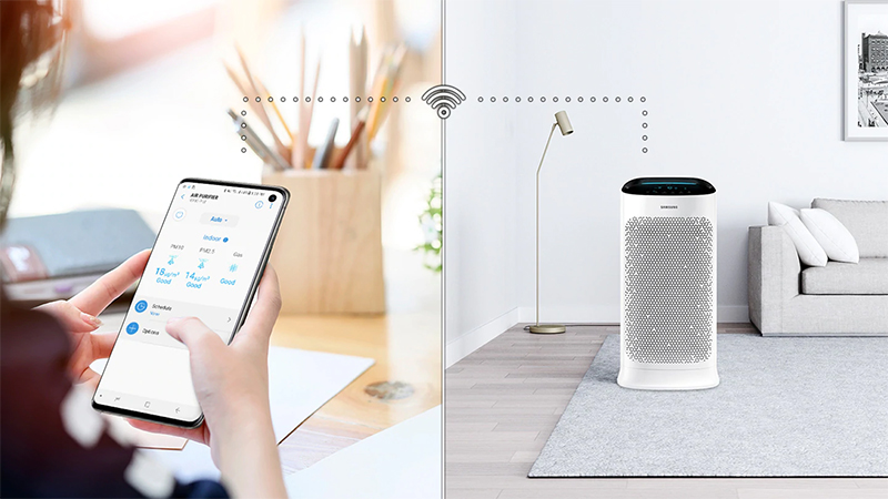 Chỉ cần thông qua màn hình điện thoại với ứng dụng SmartThings, bạn có thể chăm sóc và thường xuyên kiểm tra mức độ ô nhiễm không khí bất cứ lúc nào và bất cứ ở đâu. Ứng dụng SmartThings cho phép bạn điều khiển máy lọc không khí từ xa vô cùng tiện lợi. Chỉ với thao tác đơn giản hoặc sử dụng giọng nói, bạn sẽ dễ dàng bật hoặc tắt, kiểm tra chất lượng không khí, kiểm soát các chức năng khác và theo dõi tình trạng màng lọc.