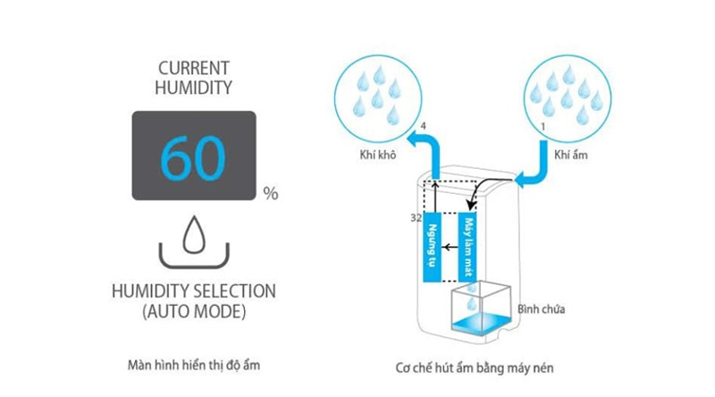 Máy hút ẩm được trang bị cảm biến độ ẩm thông minh và hệ thống hút ẩm tự động bằng máy nén.