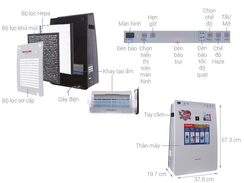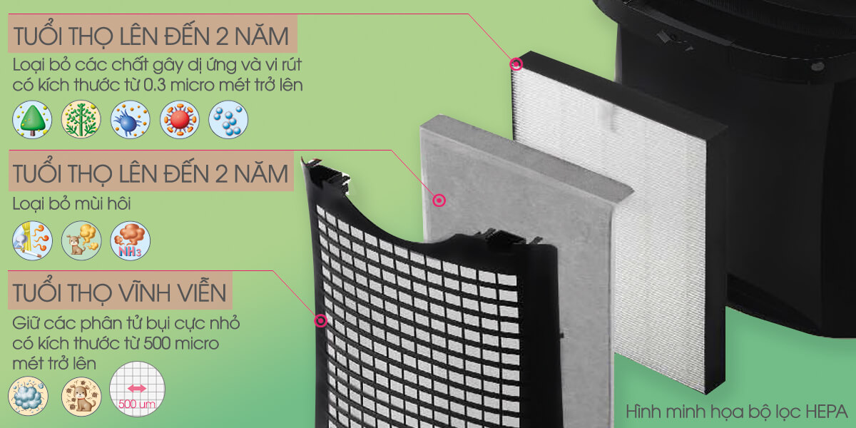 Sự kết hợp hoàn hảo giữa 3 bộ lọc: Bộ lọc bụi thô, lọc mùi than hoạt tính, bộ lọc HEPA giúp lọc sạch 99,9% vi khuẩn và các hạt bụi siêu nhỏ trong không khí, loại bỏ mùi hôi, ẩm mốc, mang lại bầu không khí trong lành cho gia đình bạn.