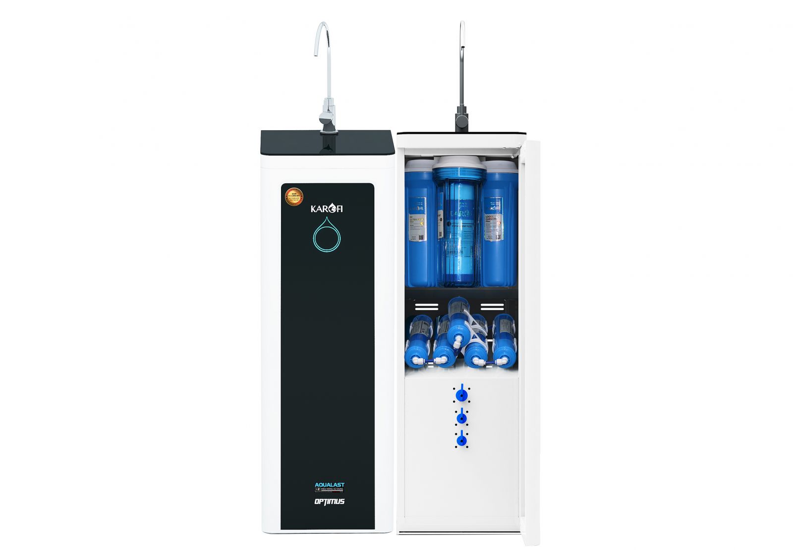 - Ngoài vòi lấy nước tinh khiết đạt chuẩn nước uống trực tiếp của Bộ Y Tế, Karofi Optimus được trang bị đường lấy nước sinh hoạt riêng sau cốc lọc thô, giúp loại bỏ cơ bản tạp chất trong nước đầu vào, thích hợp cho các hộ gia đình sử dụng nguồn nước sinh hoạt có nhiễm tạp chất (nước giếng khoan, nhiễm phèn...) cần đảm bảo cho các nhu cầu tắm cho trẻ, vệ sinh cá nhân hay rửa rau, vo gạo, rửa bát.