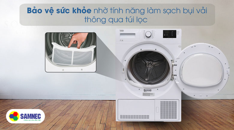 Beko DU8133GA0W được trang bị bộ lọc bụi vải ngay trước lồng sấy, để dễ dàng gom lại các vụn bụi trong quá trình sấy, tránh việc gây dị ứng lên da hay bay ra ngoài môi trường.