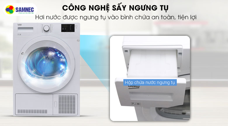 Máy sấy sử dụng công nghệ sấy ngưng tụ, có nghĩa là hơi nước sẽ được ngưng tụ và đưa vào bình chứa thay vì thoát trực tiếp ra ngoài, nhờ vậy bạn không cần lắp đặt quá phức tạp mà vẫn giúp làm khô quần áo nhanh chóng, an toàn và tiết kiệm.