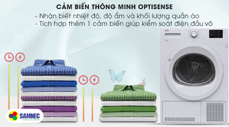 Không chỉ là sấy theo cách thông thường, việc trang bị cảm biến Optisense sẽ giúp máy sấy Beko DU8133GA0W điều chỉnh nhiệt độ và thời gian sấy phù hợp với khối lượng quần áo cho vào, giúp bảo vệ quần áo cũng như tiết kiệm điện tối ưu.