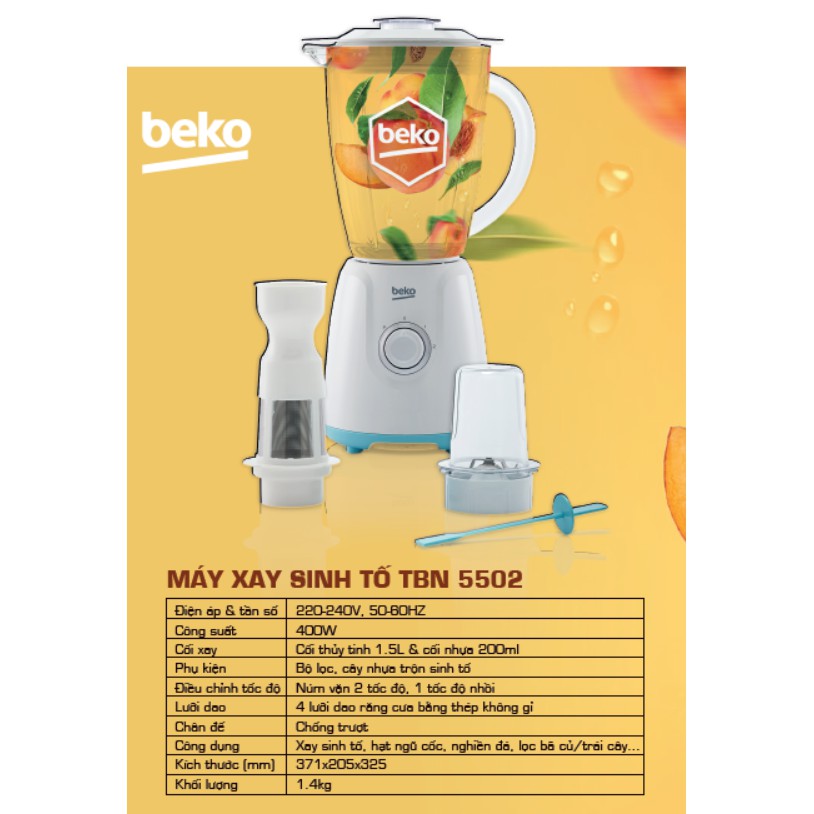Máy xay sinh tố Beko TBN 5502 công suất 400W với cối thủy tinh 1.5l & cối nhựa 200ml là lựa chọn lý tưởng cho các chị em nội trợ sáng tạo ra những thức uống bổ dưỡng và tươi mát cho cả gia đình trọn bốn mùa trong năm.