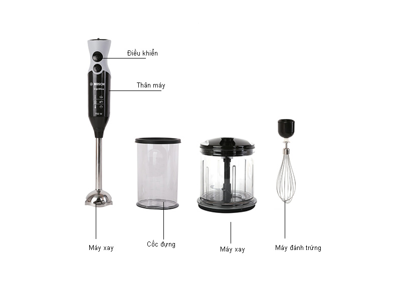 Máy xay cầm tay còn kèm theo một cốc trộn trong suốt có nắp, có vạch thể hiện mực nước để bạn có thể dùng cho việc xay sinh tố, pha chế các loại thức uống...