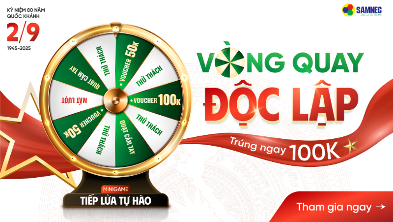 Hòa chung không khí tự hào dân tộc trong dịp kỷ niệm 80 năm Quốc khánh 2/9, Minigame "Vòng quay độc lập" nằm trong chuỗi “Tiếp lửa tự hào” hứa hẹn sẽ mang đến cho khách hàng những trải nghiệm thú vị tại Samnec. Tham gia ngay và rinh về những phần quà cực hấp dẫn!