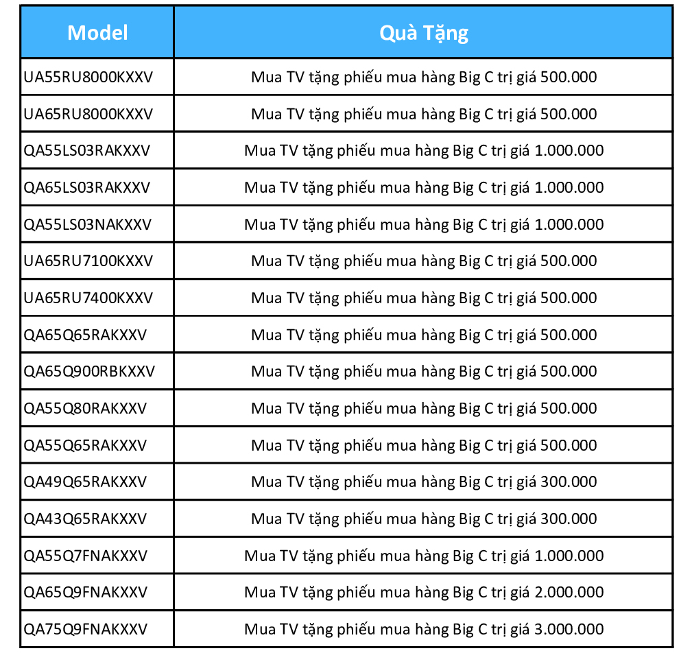 - Quý khách hàng mua sản phẩm Tivi mang thương hiệu Samsung tặng ngay phiếu mua hàng BigC giá trị từ 300K đến 3 triệu đồng, tương ứng theo từng model