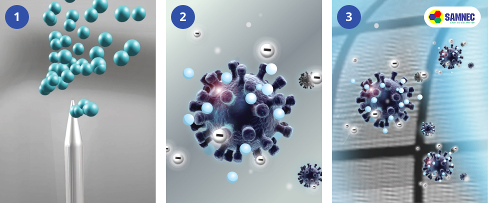 3. Theo luồng khí, các hạt bụi bị các hạt nanoe-G điện tích âm bám vào sẽ được giữ lại và vô hiệu hoá tại màng lọc điện tích dương, tác dụng lên đến 99%.