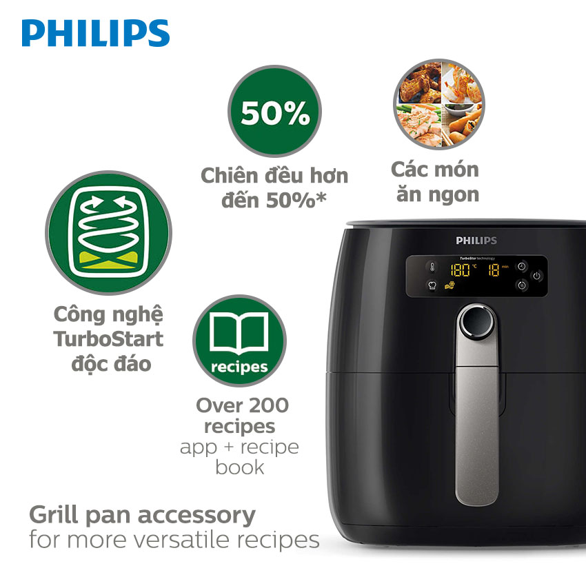 Không chỉ tuyệt vời khi chiên rán, Philips Airfryer cải tiến với công nghệ TurboStar còn cho phép bạn nướng thịt, nướng bánh và quay những thực phẩm ưa thích trong một lần duy nhất và giữ ấm cho mọi thời điểm dùng bữa trong ngày.