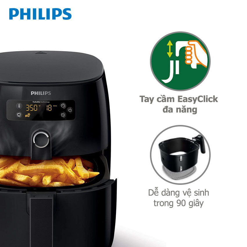 Giỏ Quick Clean của Philips Airfryer sử dụng lưới chống dính có thể tháo rời, giúp cho việc làm sạch máy trở nên nhanh chóng và dễ dàng hơn. Ngoài ra, ngăn kéo phủ lớp chống dính có thể tháo rời để vệ sinh dễ dàng. Philips Airfryer với công nghệ TurboStar sẽ giúp bạn và gia đình tránh được mùi dầu rán so với nhựng loại nồi chiên thông thường.
